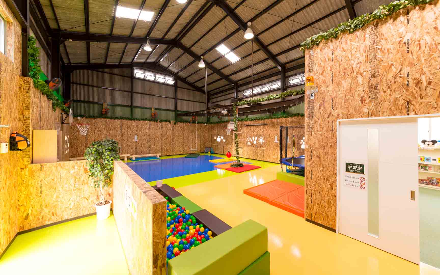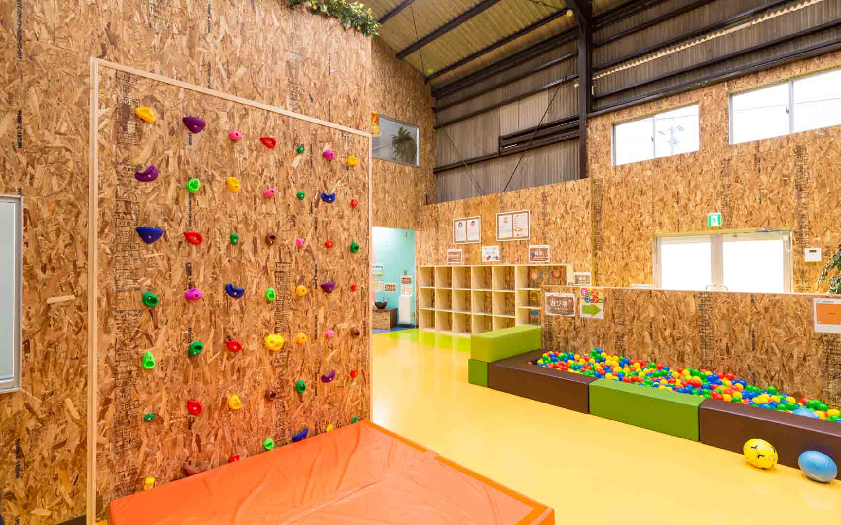 ボール運動・鉄棒・跳び箱・体幹トレーニング・ロープ遊び・ブランコ・ボルダリング・砂場・感覚遊びなどから社会生活に必要なことを学び自立に向けてサポート致します。また、2階には保護者用の見学席を設けたほか、施設全体に8台のカメラを設置し、子どもたちの安全への配慮と工夫をこらした施設となっております。